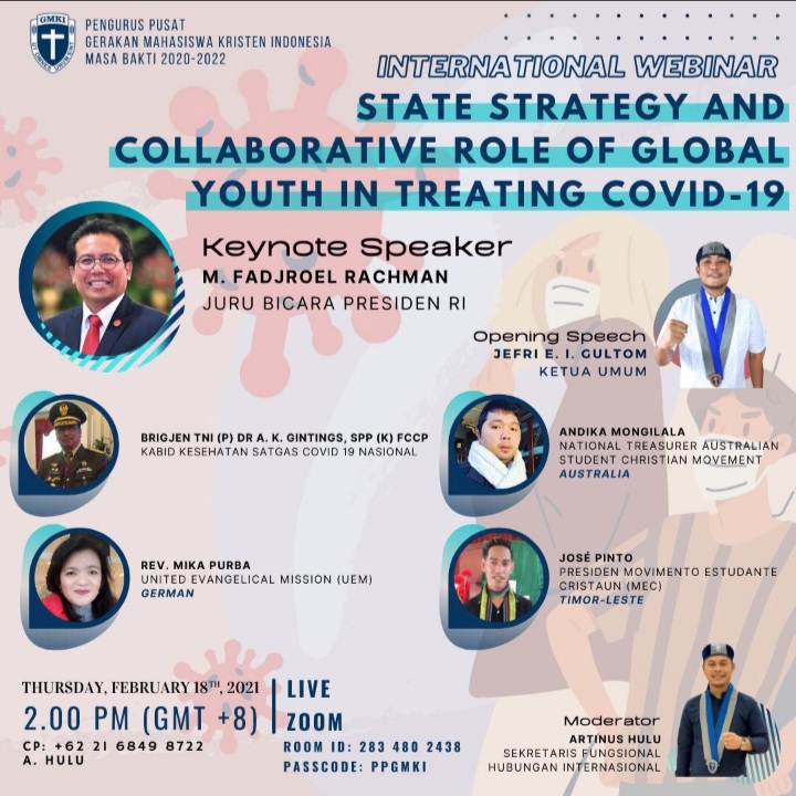 PIRAMIDA.ID- Pengurus Pusat GMKI melalui bidang hubungan Internasional melaksanakan Webinar Internasional dengan tema “State Strategy and Collaborative Role Of Global Youth In Treating Covid-19” (Strategi Negara & Kolaborasi Pemuda Global dalam Penanganan Covid-19). Kamis, 18 Feb 2021.